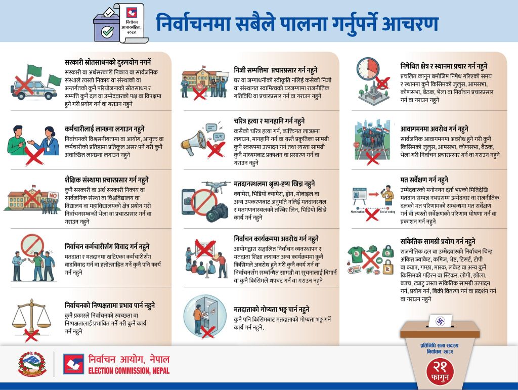 - Election code of conduct comes into effect. (2026, January 19). The Kathmandu Post. https://kathmandupost.com/national/2026/01/19/election-code-of-conduct-comes-into-effect ↩︎